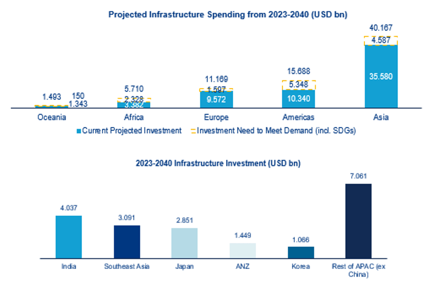 - Secular Demand Drivers and Structural Financing Gaps: Asia-Pacific’s infrastructure needs, driven by urbanization, economic growth, climate adaptation, digitalization, and connectivity, are projected to require around USD 42 trillion by 2040. Key sectors include transport, energy (including renewables and green hydrogen), telecom, and digital infrastructure. Historically, 90% of funding has come from the public sector9 , but even a 10% private share implies a USD 417 billion private credit opportunity. Private credit can support platform scaling, consolidation, and equity release. India and Southeast Asia alone will need over USD 7 trillion, with energy transition and infrastructure build-out fueling diverse themes like green ammonia.