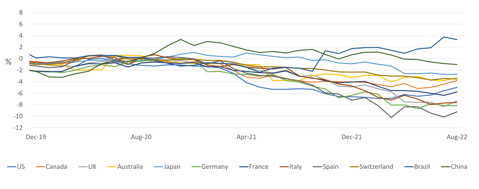 Exhibit 1: month-end 1-year government bond yields (local currency) adjusted for monthly headline consumer price inflation (year-on-year, not seasonally adjusted)