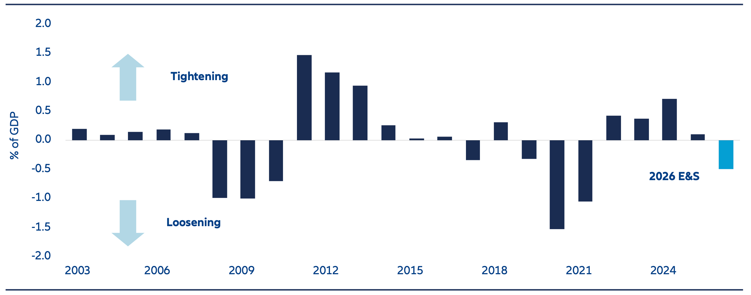 - Euro zone fiscal policy is set to loosen modestly in 2026, led by Germany’s historic spending push.