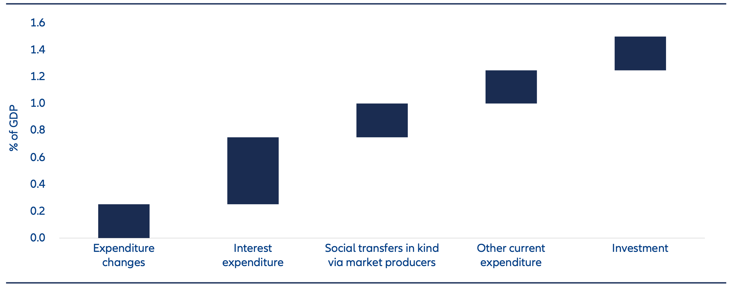 However, the largest component of the spending increase – 0.5 percentage points of GDP – is “social transfers in kind via market producers”, typically representing healthcare spending, which should be easier to implement (see Exhibit 2). In contrast, defence spending accounts for less than 0.5 percentage points, and public investment (including defence investment) for only 0.25 percentage points of the 1.5% of GDP deficit widening. Therefore, we should probably pencil in a deficit well above 4% of GDP – more than previously expected.