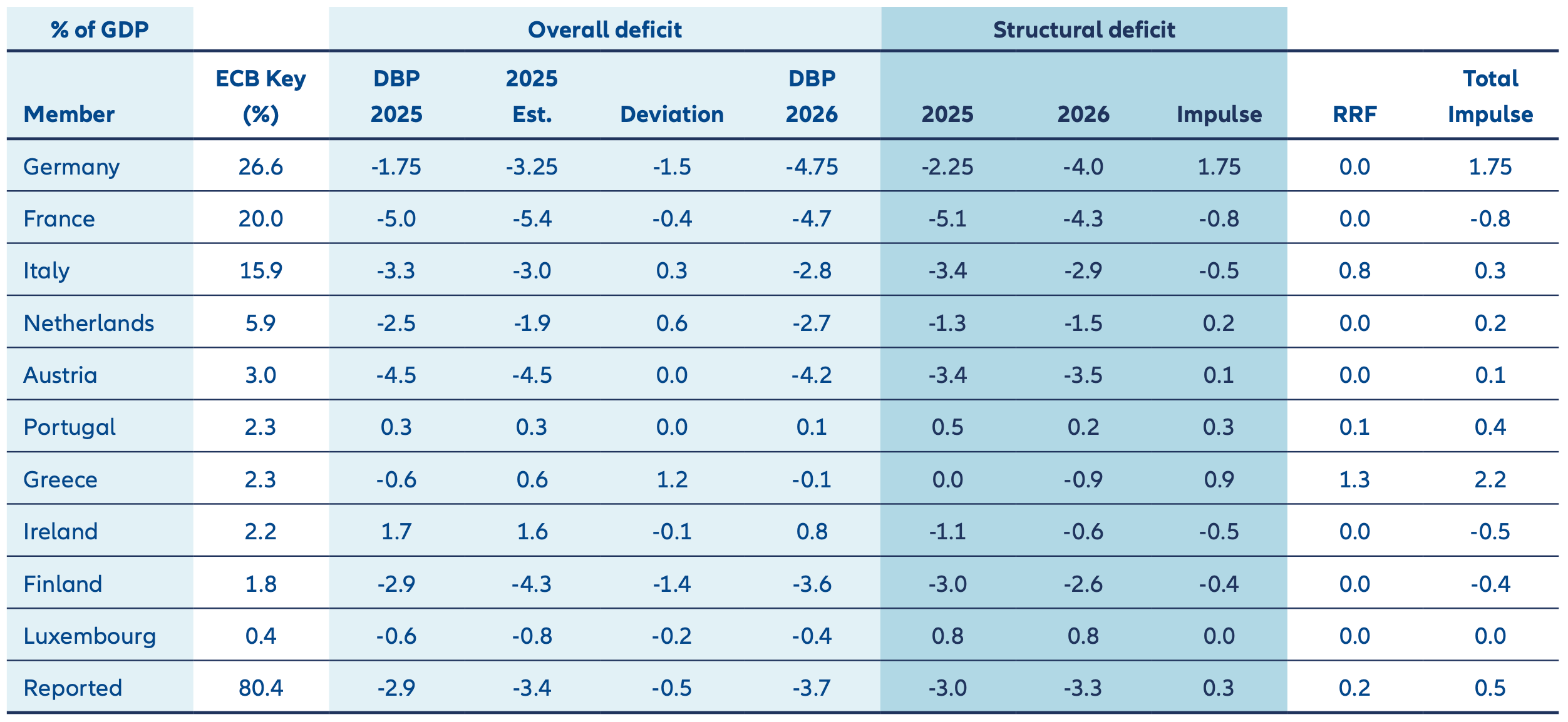 The largest fiscal impulse by far comes from Germany, where the government plans to widen the budget deficit to 4.75% of GDP in 2026 – the largest since 1975 (excluding the technical one-off deficit of 9.4% of GDP in 1995). Since no recession is associated with the deficit, this implies a structural widening of 1.75% of GDP.