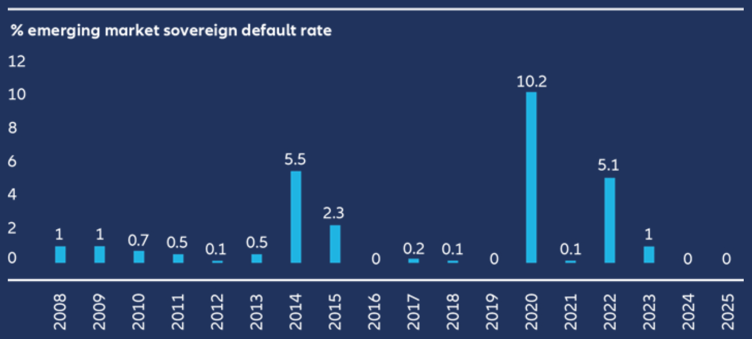 - Credit defaults - Global high yield defaults at end-September stood at 1.4%, largely from CCC-rated credits. For 2026, we estimate a default rate of around 2%, again driven by CCCs. This compares with a long-term average of 4.5%. The default landscape has improved due to higher average credit quality, weaker issuers being served by private credit, and active creditors staving off imminent defaults with pre-emptive restructuring.