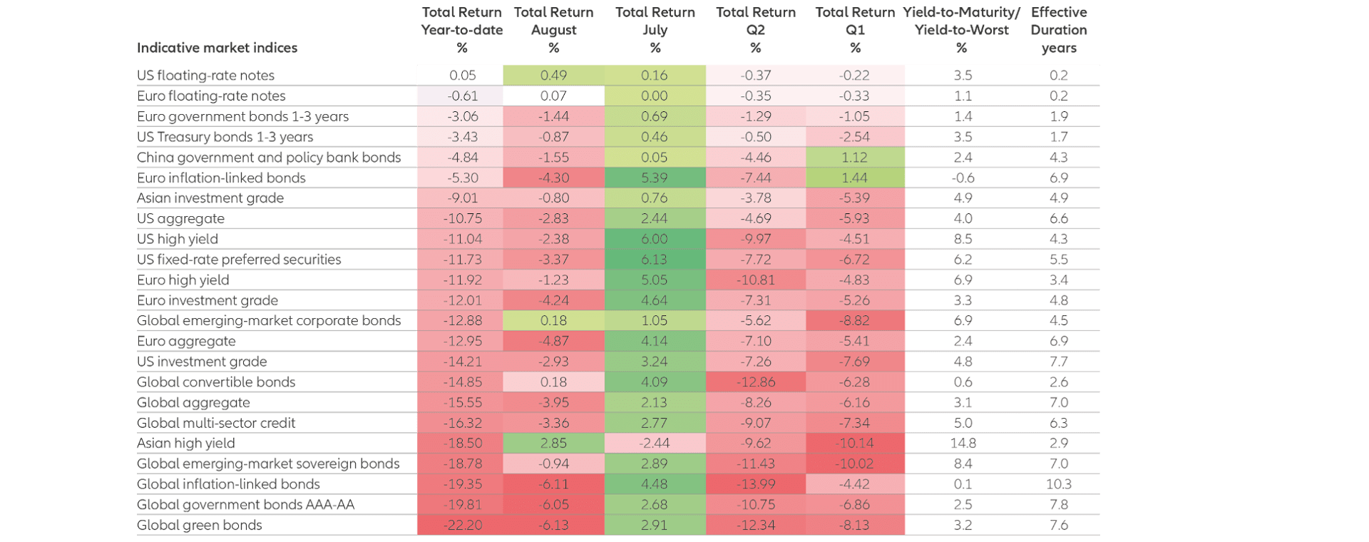 Source: Bloomberg. ICE BofA and JP Morgan indices; Allianz Global Investors. Data as at 31 August 2022. Index returns in USD (unhedged) except for Euro indices. Yield-to-worst adjusts down the yield-to-maturity for corporate bonds which can be “called away” (redeemed optionally at predetermined times before their maturity date). Effective duration also takes into account the effect of these “call options”. Past performance does not predict future returns. See the disclosure at the end of the document for the underlying index proxies.