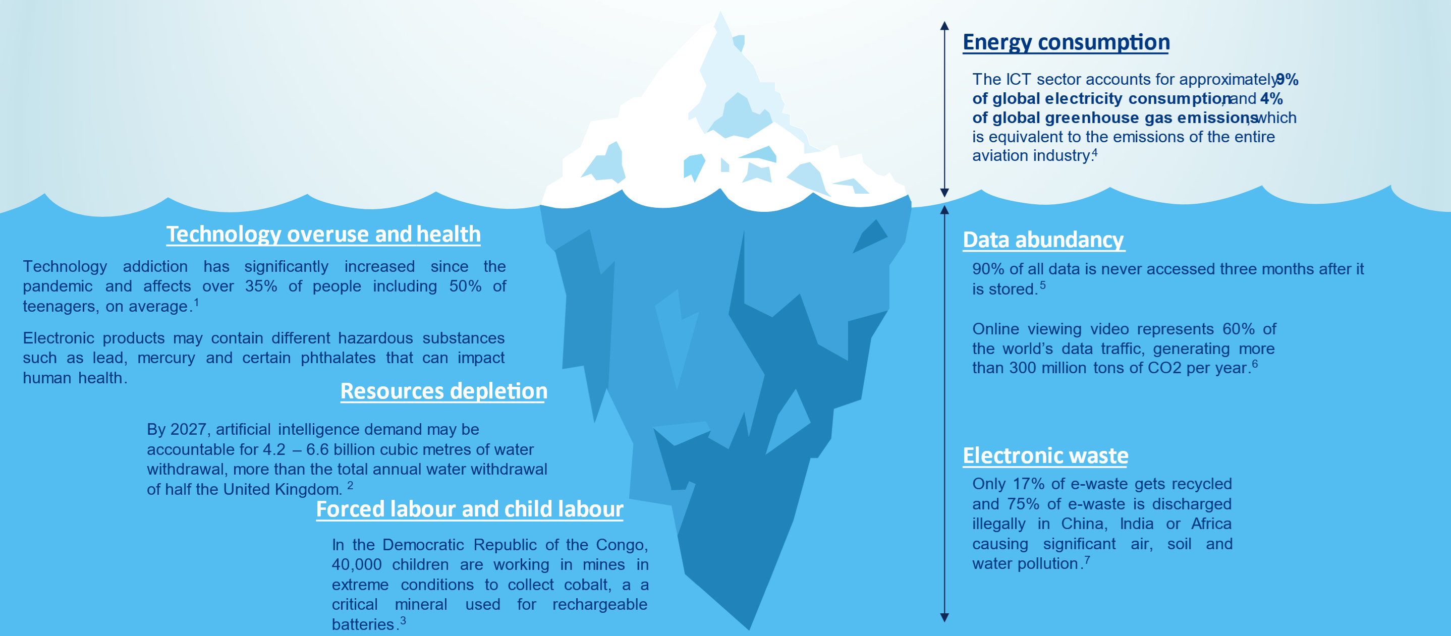 4-6% of global electricity consumption – a figure that is set to increase by 2030 to 20%.3 Additionally, a vast and under-appreciated amount of water is used – from the sourcing of strategic metals and minerals through to cooling equipment for optimal performance. The extraction of these minerals is also becoming increasingly invasive to ecosystems, in terms of habitat destruction and pollution.Meanwhile, technology products’ contribution to global electronic waste (e-waste) is projected to reach 120 million tons annually by 2050, if current trends persist.4 E-waste is highly polluting,5 a problem exacerbated in lower income countries by illegal dumping. Without a circular economy – to promote continuous use, recycling and repurposing of materials – the unsustainable cycle of extraction, pollution and waste will continue.