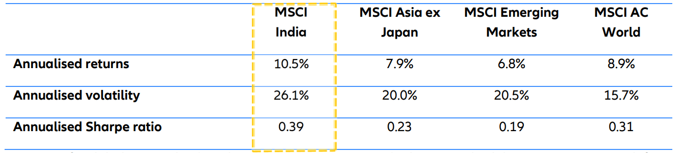 - While volatility in Indian equities has registered above regional averages, it nonetheless still demonstrates a significantly higher Sharpe ratio (excess returns adjusted for volatility) than most other Asian, emerging, and even global markets.