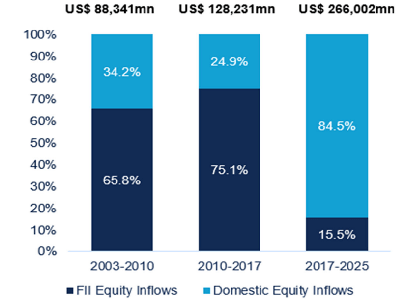 - In fact, domestic Indian investors account for roughly 85% of inflows into equities over the last eight years, far outweighing the impact of foreign flows.3