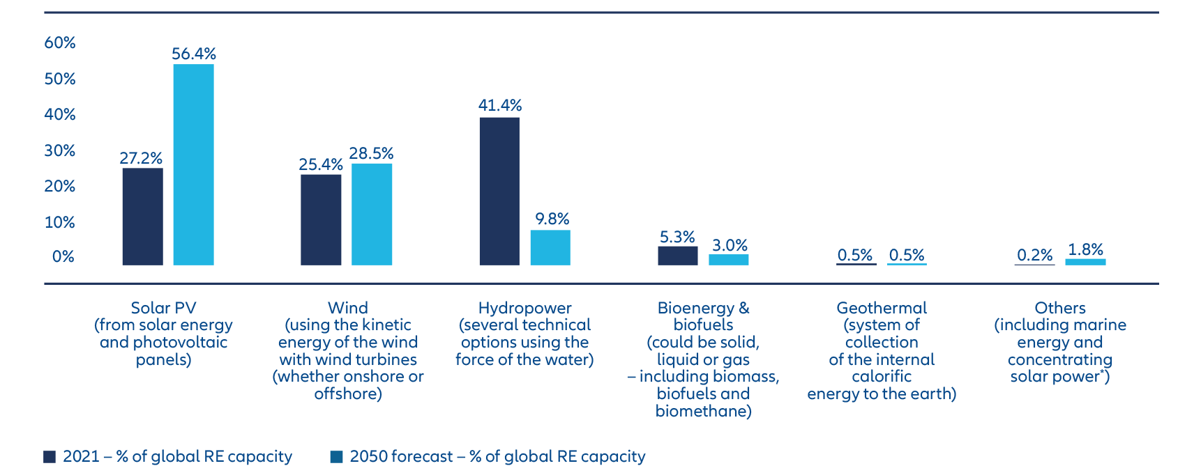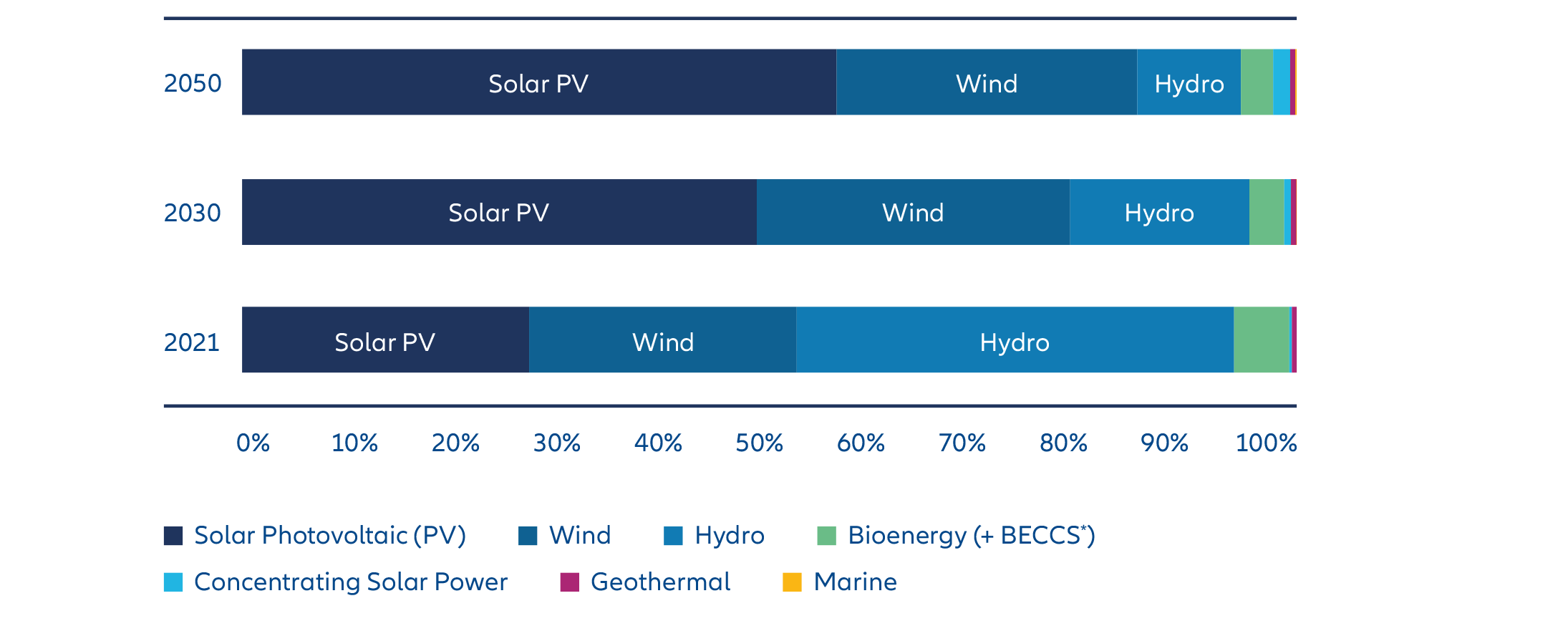 - Solar and wind will replace hydro as the dominant sources of power in a renewable energy mix that will have to grow its proportion of the total global energy mix from 15–20% today to 60–80% by 2050.